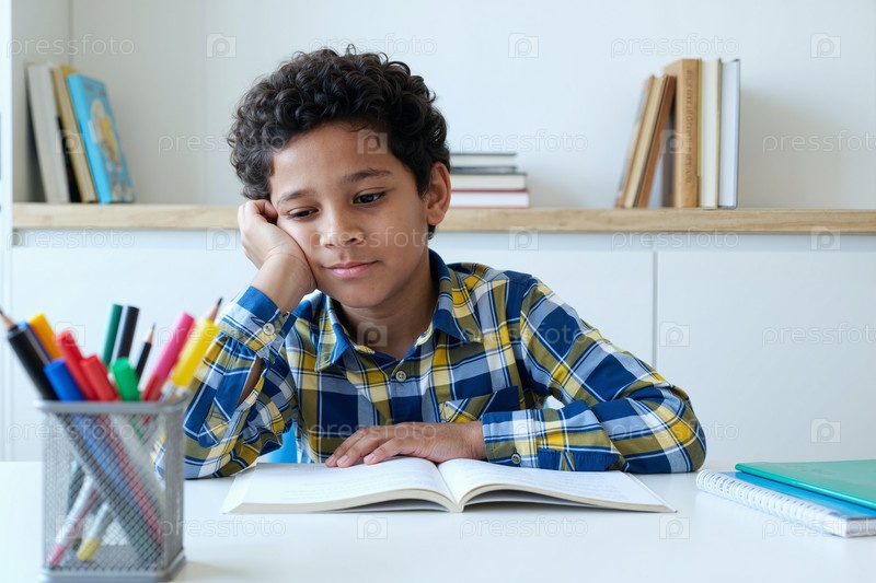 Скученный испаноязычный мальчик читает книгу, сидя за столом в современном классе