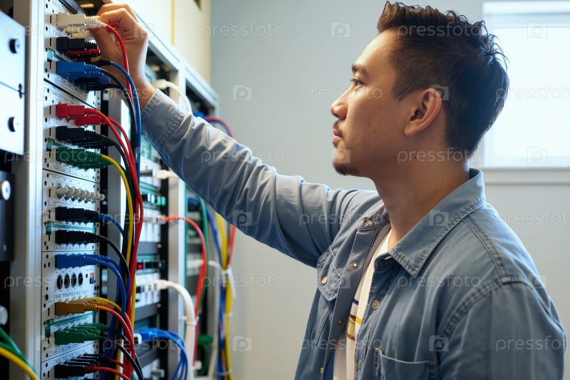 Молодой взрослый азиатский мужчина управляет сетевыми кабелями в среде серверной комнаты