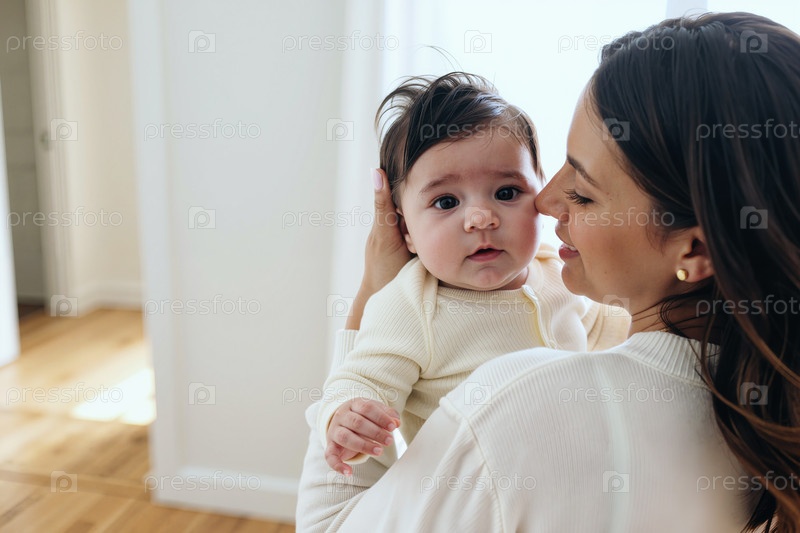 Молодая женщина держит младенца-ребенка в помещении, показывая любовь