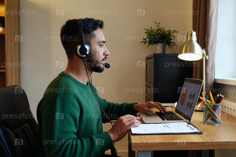 Молодой взрослый мужчина, носящий наушники работает удаленно за рабочим столом