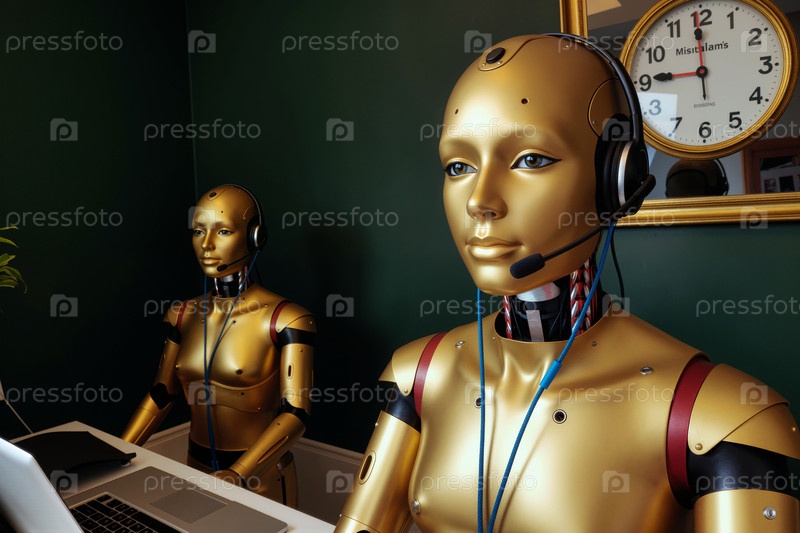 Гуманоидные роботы, носящие наушники работают на ноутбуках в двух офисных условиях