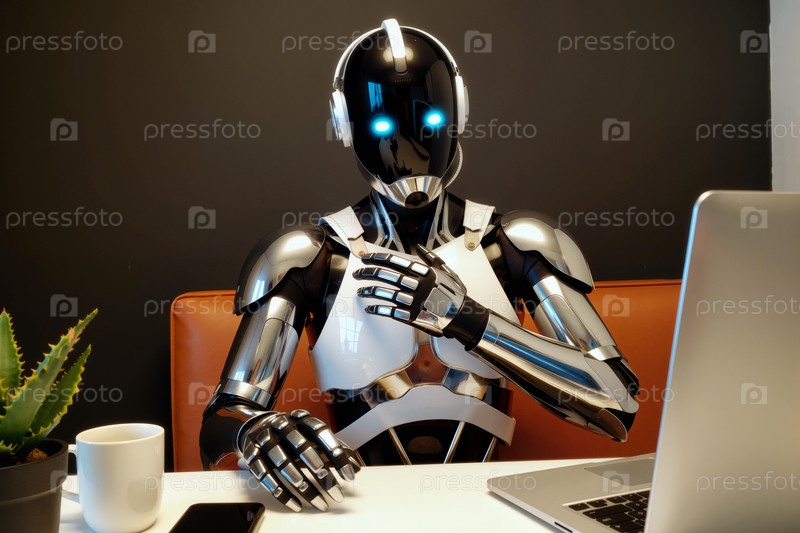 Человекоподобный робот сидит за рабочим столом, использует ноутбук и прикасается к груди в офисе