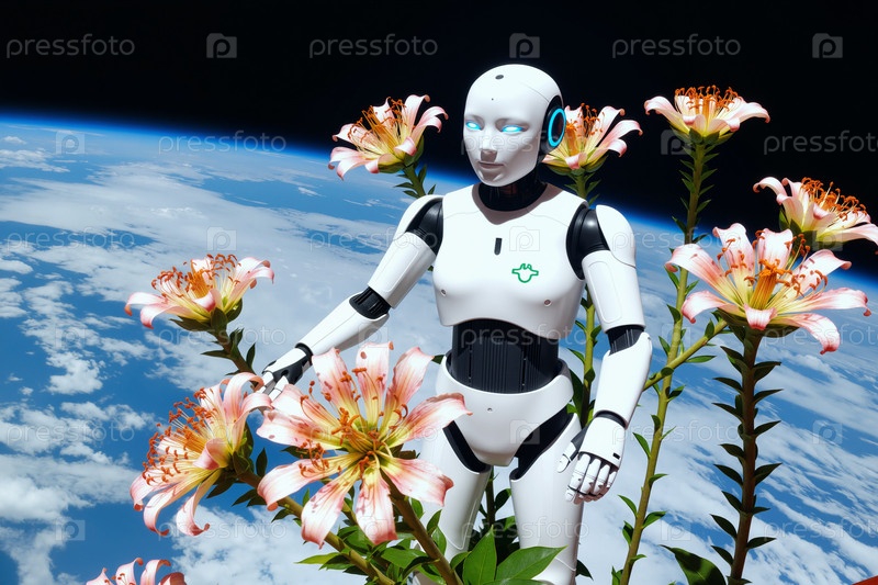 Гуманоидный робот, взаимодействующий с лилиями в космическом пространстве над Землей