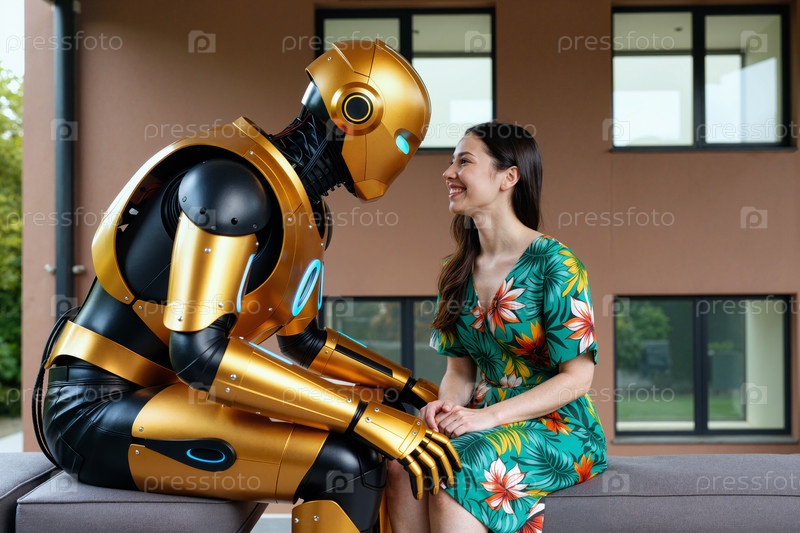 Молодая женщина улыбается во время взаимодействия с гуманоидным роботом на открытом воздухе