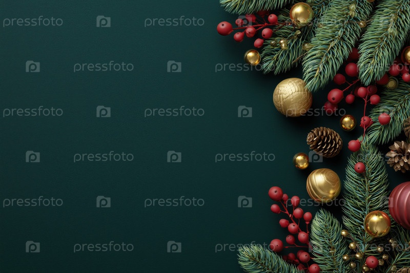 Рождественские сосновые ветви с красными ягодами и золотыми орнаментами устраиваются празднично
