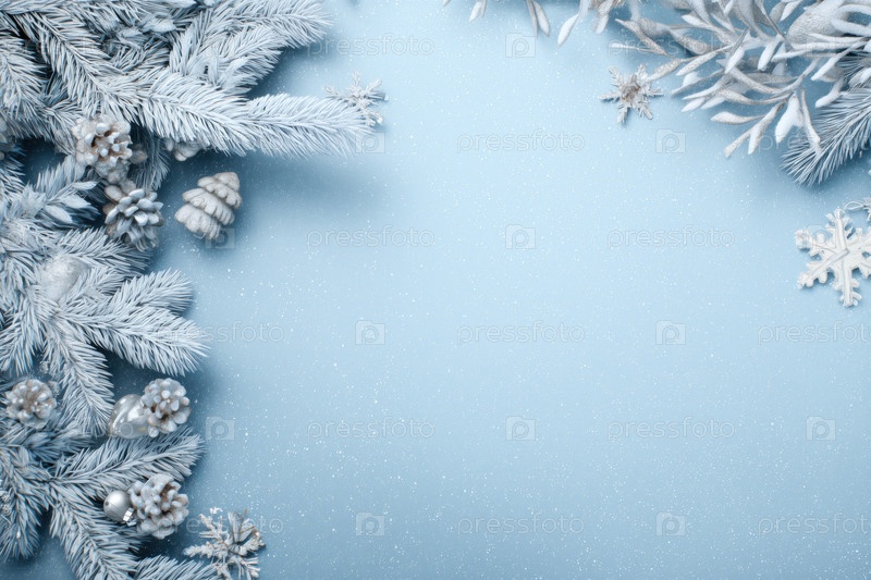 Зимние сосновые ветви и снежинки создают праздничный праздничный фон