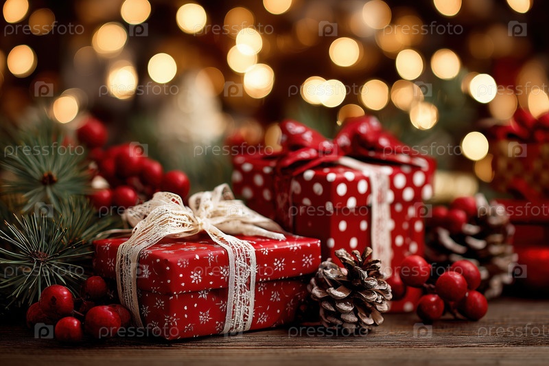 Рождественские подарки с соснами и ягодами, расположенными на праздничном деревянном столе
