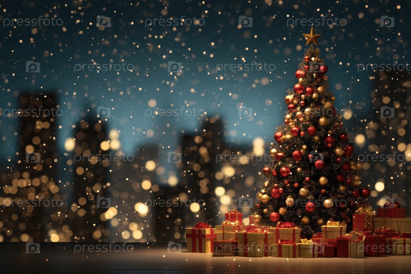 Рождественская елка украшена подарками, стоящими на горизонте города ночью