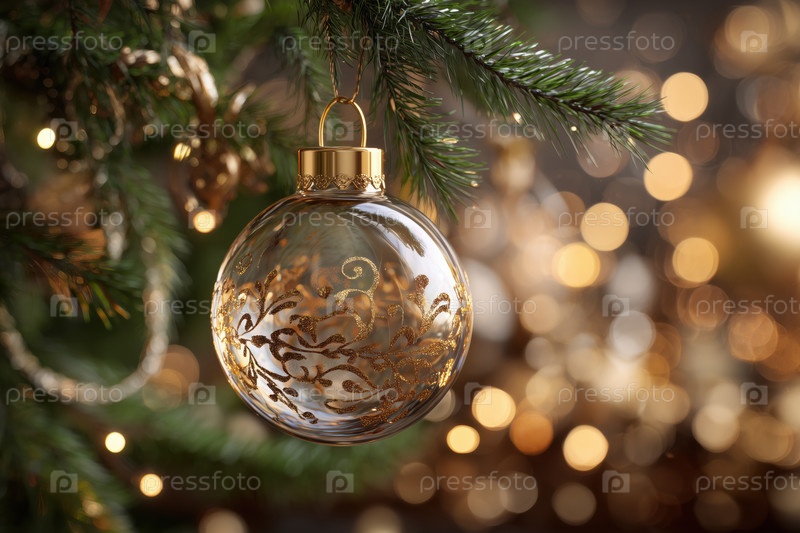 Рождественское украшение висит на ветке дерева с праздничными огнями, светящимися стеклом