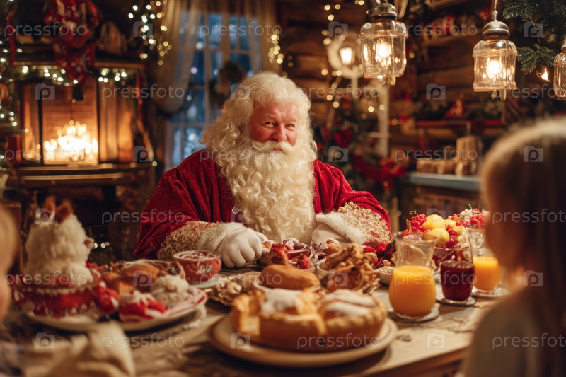 Старший мужчина, одетый в Санта-Клауса улыбается во время праздничной трапезы