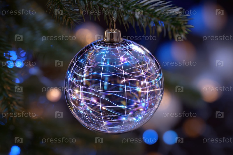 Рождественское украшение, висящее на ветке дерева и отражающее праздничные огни
