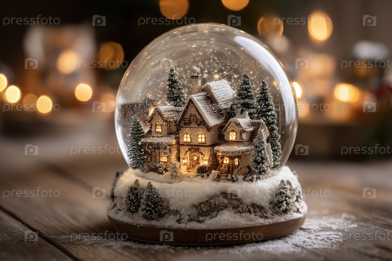 Снежный глобус с освещенным миниатюрным домом, окруженным сосновыми деревьями