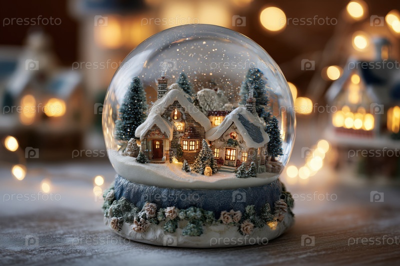 Снежный глобус с миниатюрной зимней деревенской сценой, окруженной огнями
