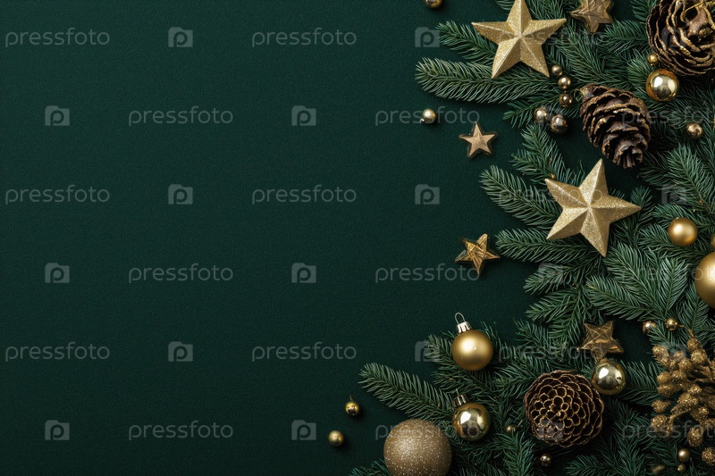 Рождественские украшения, расположенные на зеленом фоне с сосновыми конусами и звездами