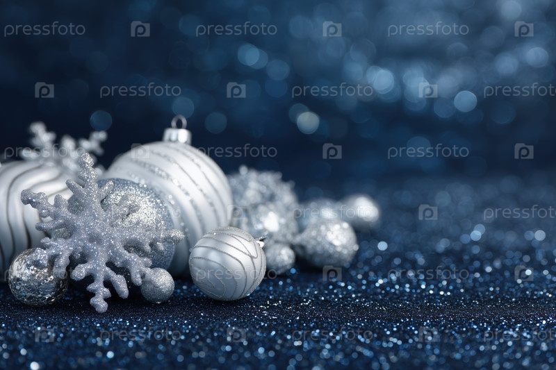 Серебряные рождественские украшения и снежинки, лежащие на блестящей голубой поверхности