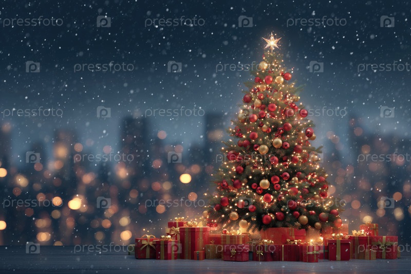 Декорированная рождественская елка освещает ночной городской пейзаж, окруженный подарками