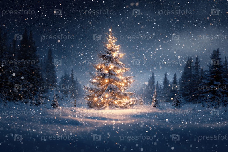 Освещенная рождественская елка стоит в снежном лесу во время зимней ночи