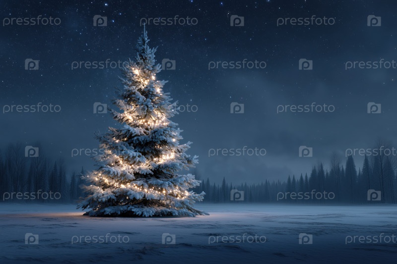 Снежная рождественская елка освещает лес зимней ночи под звездным небом