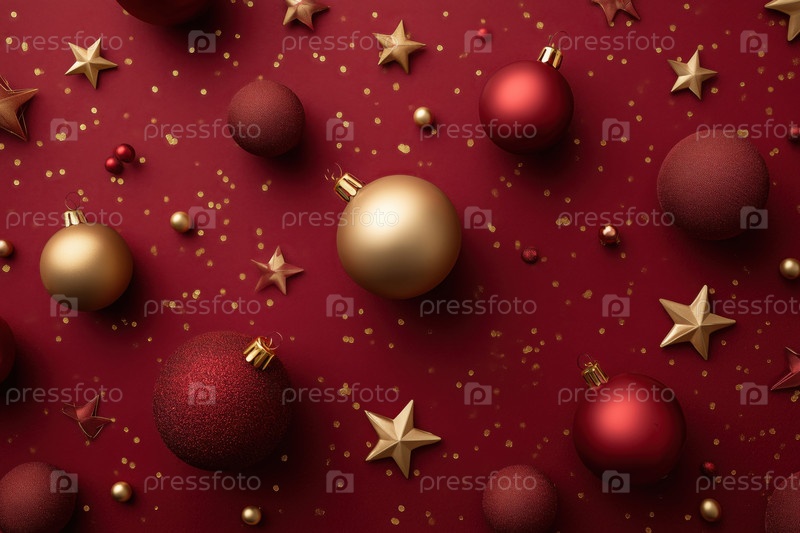 Рождественские украшения и золотые звезды рассеиваются на красном праздничном фоне