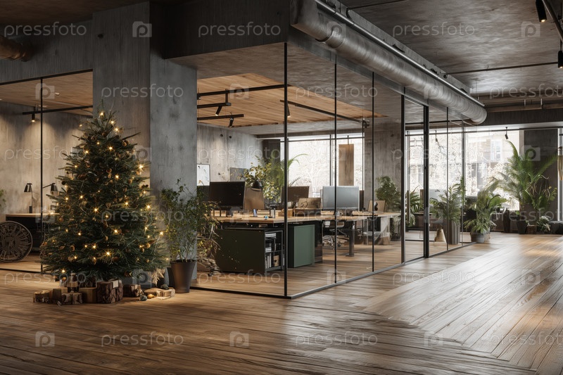 Современное офисное рабочее пространство с рождественской елкой и естественным дневным светом