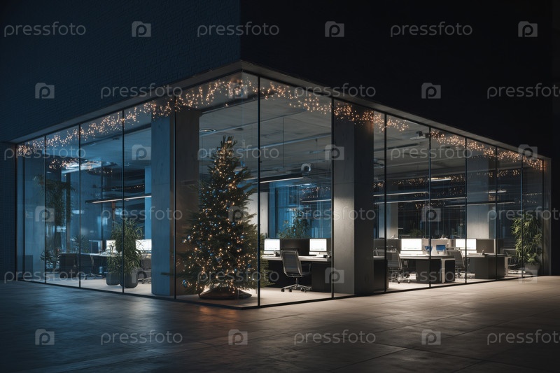 Пустой современный офисный интерьер с рождественской елкой, освещающей ночную сцену