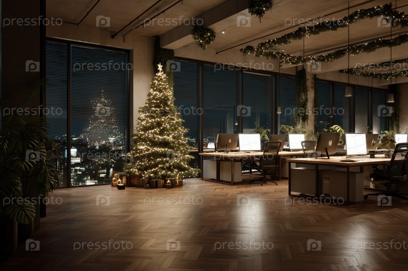 Пустой современный офис с рождественской елкой, освещающей ночной городский пейзаж