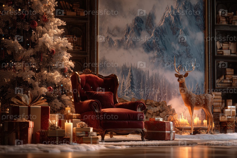 Роскошная рождественская гостиная с креслом и украшенной елкой