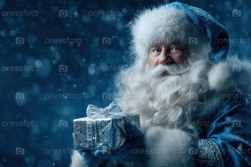Портрет пожилого человека в костюме Санты, держащего подарочную коробку
