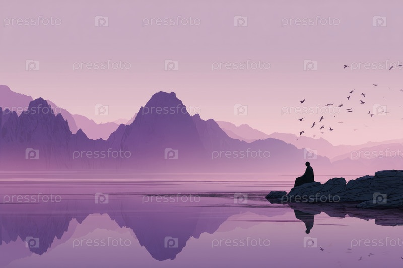 Силуэт мужчины среднего возраста, медитирующего у озера на восходе солнца с летающими птицами