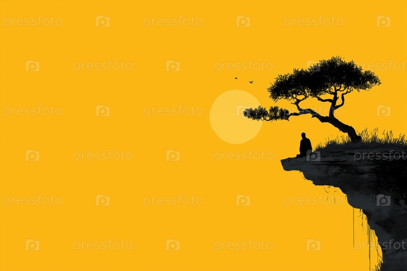 Силуэт молодого взрослого мужчины, медитирующего под деревом при закате солнца на краю обрыва