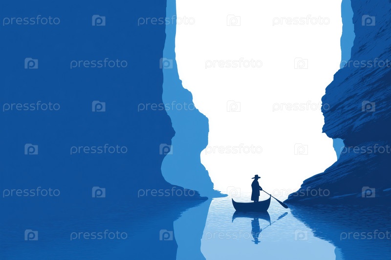 Силуэт молодого взрослого мужчины, греблящего лодкой через Узкий каньон на восходе солнца