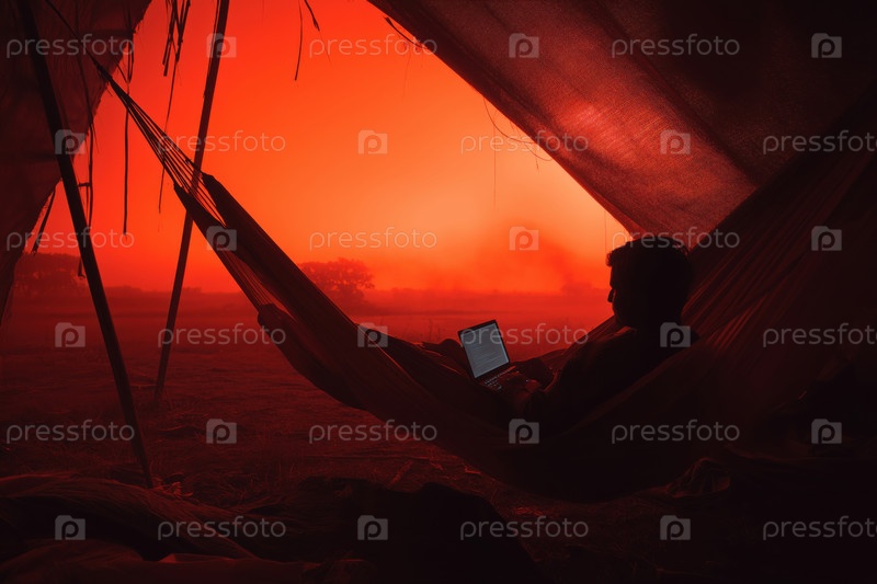 Молодой взрослый мужчина использует ноутбук, отдыхая на гамаке в Sunset Outdoors