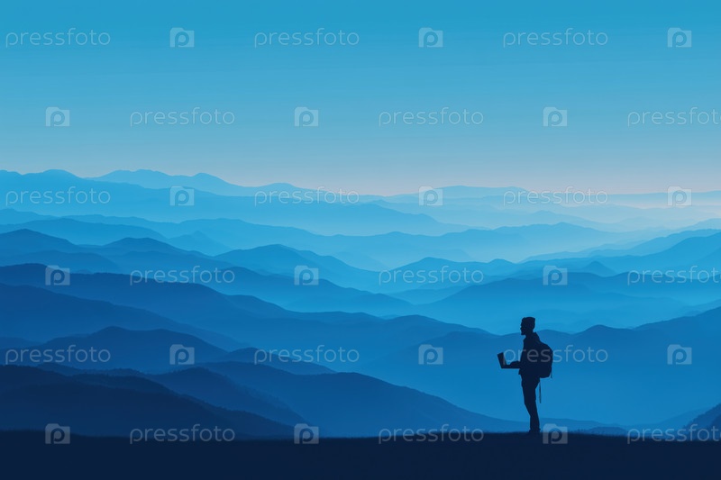 Молодой взрослый мужчина стоит на горном хребте, используя ноутбук с видом на голубые холмы