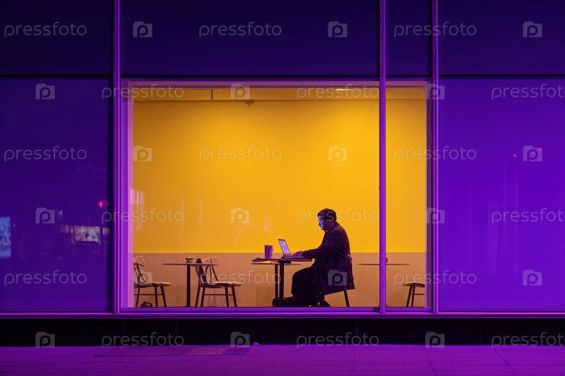 Молодой взрослый мужчина работает на ноутбуке один в современном офисе ночью