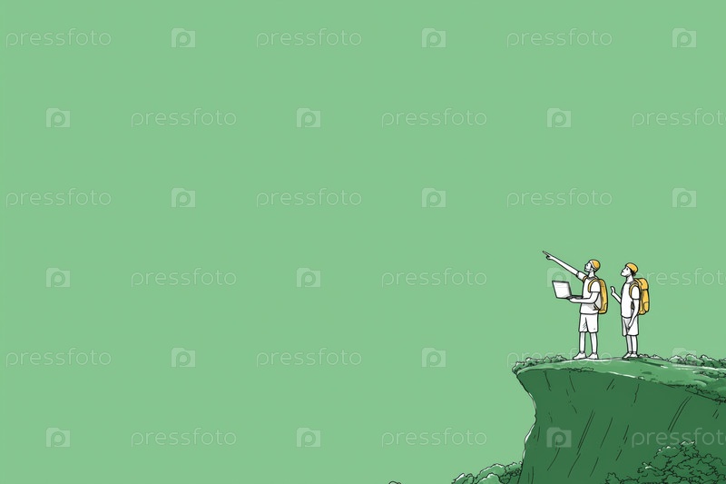 Два молодых взрослых инженера, стоящих на обрыве и анализирующих ландшафт с помощью ноутбука
