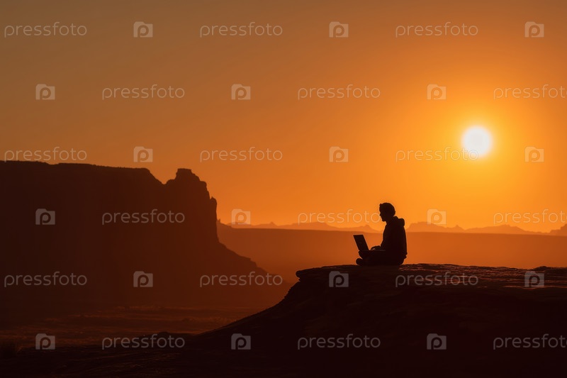 Молодая взрослая женщина, использующая ноутбук на открытом воздухе во время захода солнца в отдаленном пустынном пейзаже