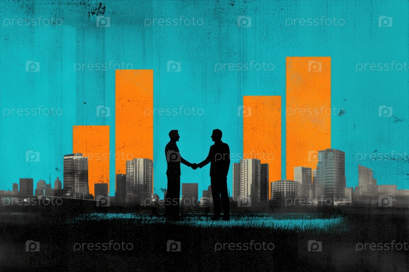 Два молодых взрослых мужчины, пожавшие руки против Cityscape с Bar Graphs Rising