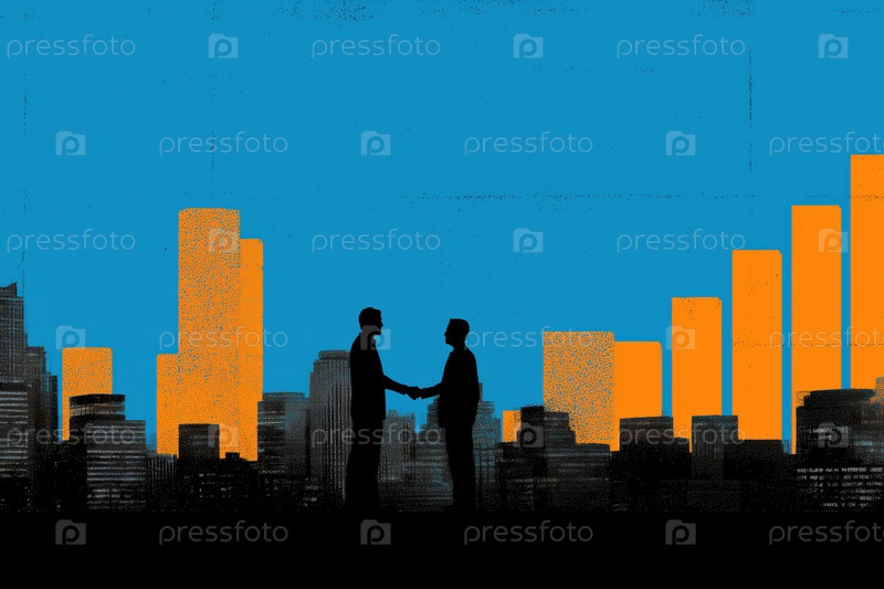 Два молодых взрослых мужчины, пожавшие руки против городского горизонта Силуэт
