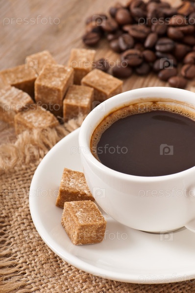 Чашка кофе, кофе в зернах и коричневый сахар крупным планом