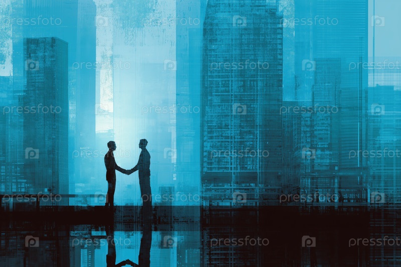 Два молодых взрослых мужчины, пожавшие руки в современном городском ландшафте