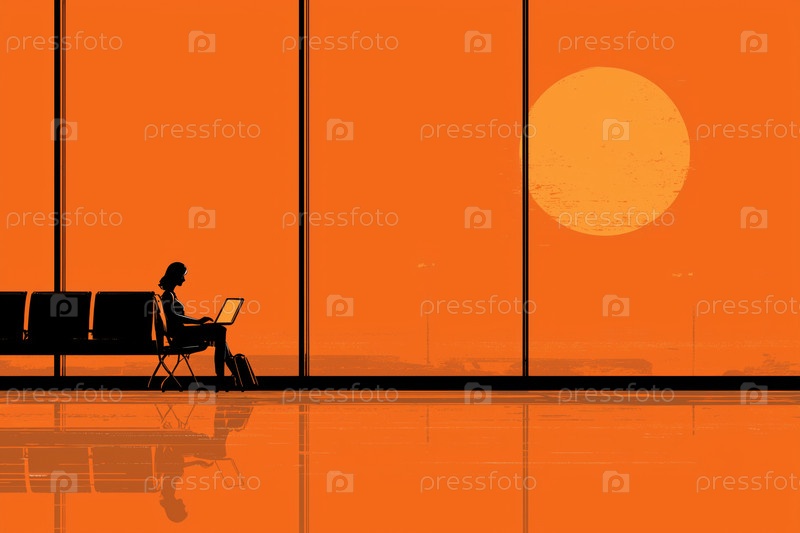 Молодая взрослая женщина использует ноутбук, сидя одна в терминале аэропорта на закате