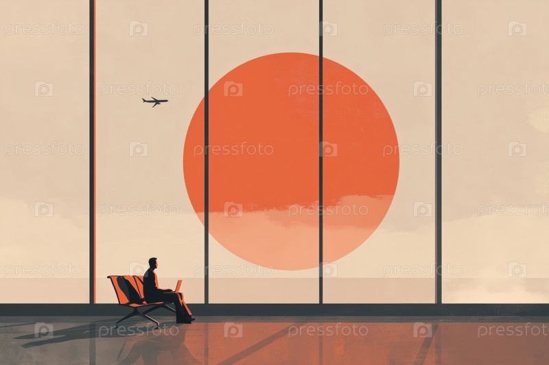 Молодой взрослый мужчина сидит с ноутбуком в аэропорту, наблюдая за самолетом
