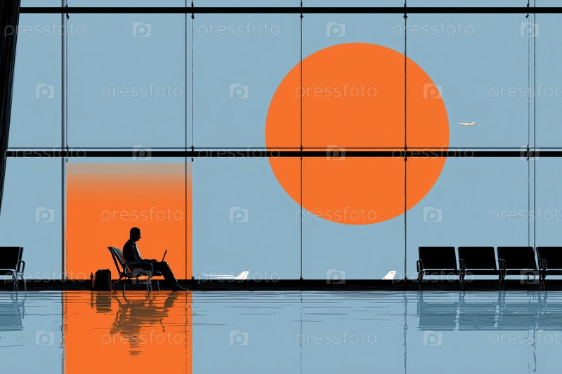 Молодой взрослый мужчина работает на ноутбуке в терминале аэропорта во время восхода солнца