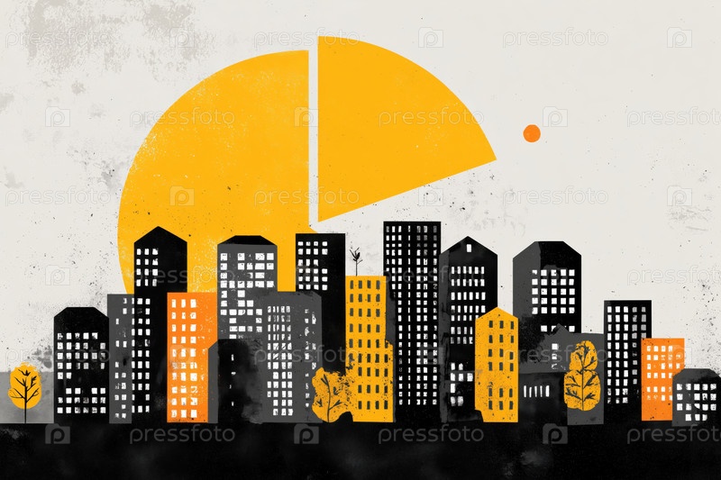 Abstract City Skyline Illustrating Urban Growth with Large Yellow Pie Chart Абстрактный горизонт города, иллюстрирующий городской рост с помощью большого диаграммы желтого пирога