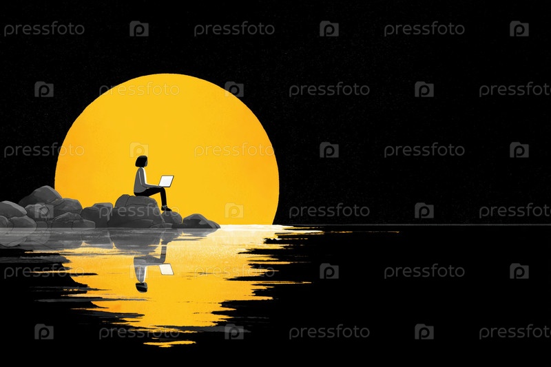 Молодая взрослая женщина, сидящая на скалах с помощью ноутбука в воде во время захода солнца