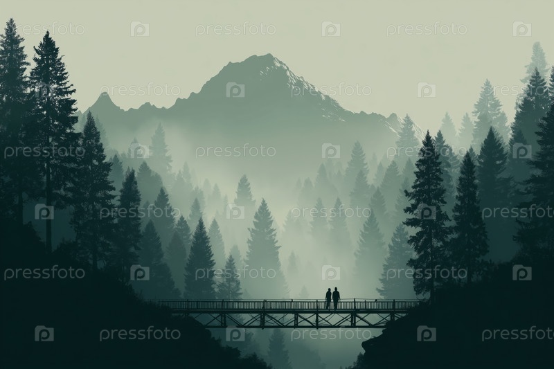 Силуэты двух молодых взрослых, стоящих на мосту с видом на горный лес