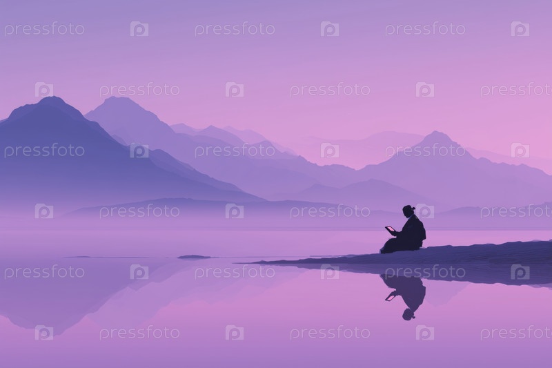 Силуэт молодой взрослой женщины, читающей планшет рядом с озером на восходе солнца