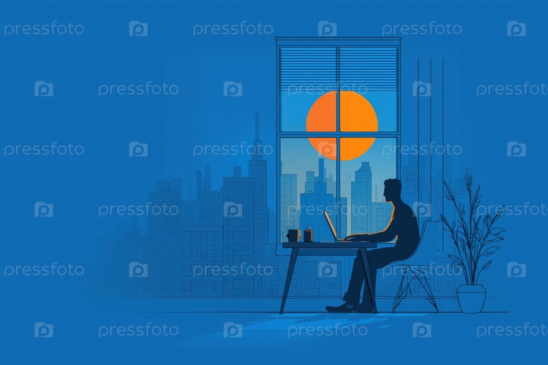 Молодой взрослый мужчина работает на ноутбуке в городской квартире в Санрайзе
