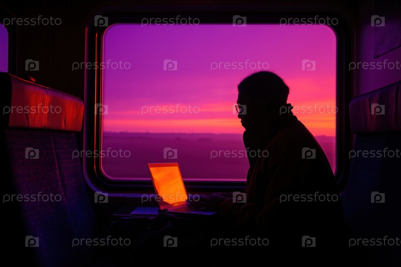 Молодой взрослый мужчина использует ноутбук во время поездки на поезде во время яркого заката