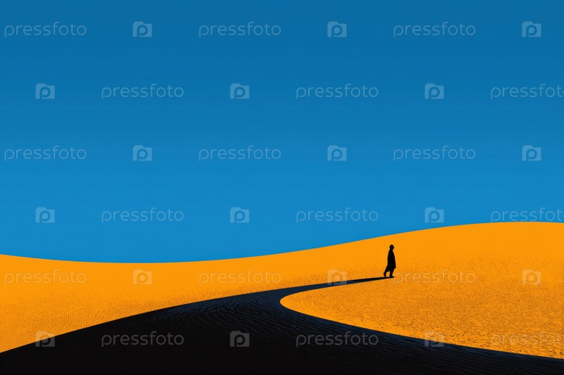 Одинокий мужчина среднего возраста ходит вдоль песчаной дюны под чистым голубым небом